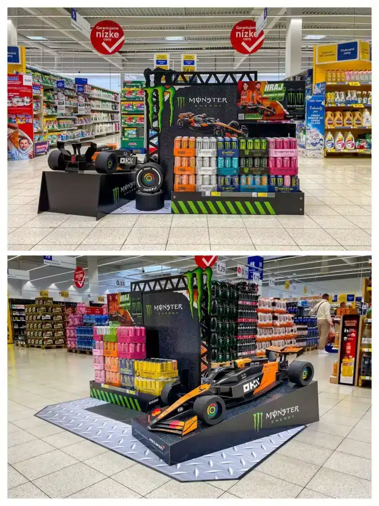 Kreatívny prvok, ktorý zaujme každého nakupujúceho, je veľmi realistická replika monopostu F1 aj s príslušnou farebnosťou stajne McLaren. Slúži zároveň ako nosná časť posolstva kampane – teda upriamuje pozornosť na súťaž o možnosť vyhrať osobné stretnutie (meet & greet)s aktuálnymi jazdami tímu. Skalní fanúšikovia vedia, že sú nimi Lando Norris a Oscar Piastri. Vystavenie dopĺňala podlahová grafika a celé portfólio nápojov Monster, vrátane veľmi dobre sa predávajúcej žltej plechovky „Monster Energy Lando Norris Zero Sugar“.