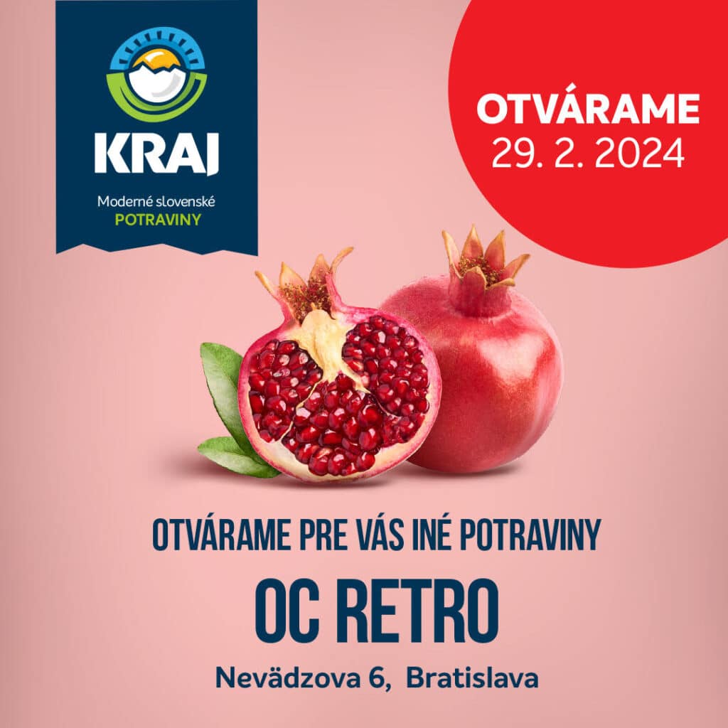 Spoločnosť TERNO real estate otvára už 33. predajňu KRAJ. Zákazníci ju nájdu v OC Retro na Nevädzovej ulici v bratislavskom Ružinove od 29. 2. 2024. Nová predajňa s rozlohou 736 m2 ponúka široký sortiment slovenských výrobkov i plnohodnotné potraviny pre ľudí s potravinovými intoleranciami a alergiami.