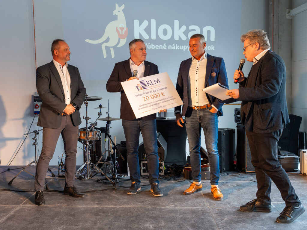 Spoločnosť KLM Real Estate sa rozhodla aj pri otvorení tohto OC Klokan investovať niečo naviac v regióne. Pre Žilinu to znamená odovzdanie šeku FNsP Žilina vo výške 20.000 EUR na nákup technického vybavenia pre vzdelávanie lekárov a takisto šek v hodnote 200.000 EUR Nadácii Detského kardiocentra ako výraz našej podpory a uznania ich obetavej práce. „Práve v týchto chvíľach je napojené dvojmesačné dievčatko na prístroj zakúpený vďaka tejto pomoci. Pani primárka, docentka Kovačíkova pozdravuje a veľmi pekne ďakuje, je to pre nás obrovská pomoc,“ uviedla riaditeľka nadácie, PhDr. Mária Kadlečíková.