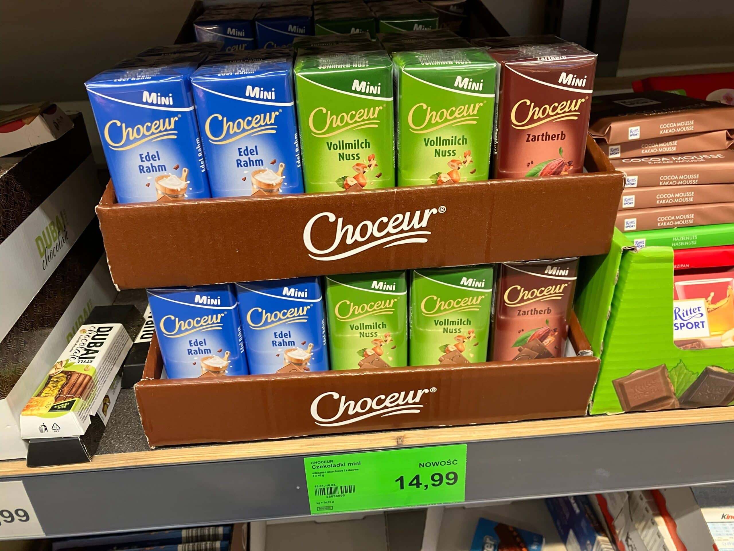 Aldi, taktiež integrovaný vo vertikále obstarávania a výroby čokolády, umiestňuje vlastnú značku priamo vedľa ikonických poľských značiek. Dôveryhodnosť svojej privátky posilňuje viditeľne prezentovanými zákazníckymi hodnoteniami produktov.